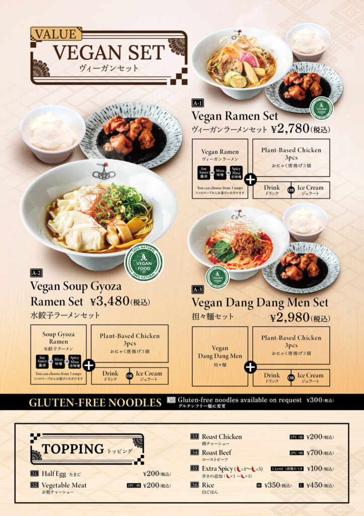 私たちのラーメンのベースのスープは、玉ねぎ・セロリ・ニンジンをベースに、昆布とにんにくを独自にブレンドしたコクと旨味を引き出した秘伝のスープです。動物性食材は一切使用していません。 - Do you have any non-vegan dishes?